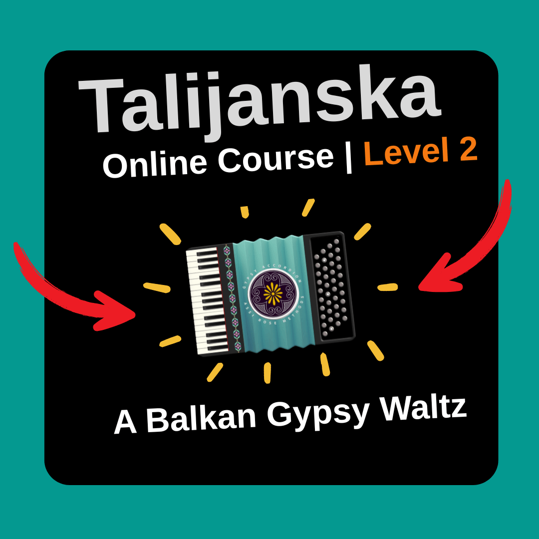 Talijanska is a perfect choice for beginner accordionists who want to explore the vibrant, free-spirited world of Romani music. This beautiful waltz captures the joy, renewal, and celebratory spirit of Romani (Gypsy) culture through an expressive and soulful melody. Its flowing 3/4 rhythm gives the piece a graceful, dance-like quality, while playful ornaments, subtle flourishes, and swinging phrasing make the music feel alive and full of character.